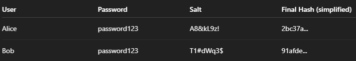 - Together, they make your password hashes unique, unpredictable, and hard to reverse.